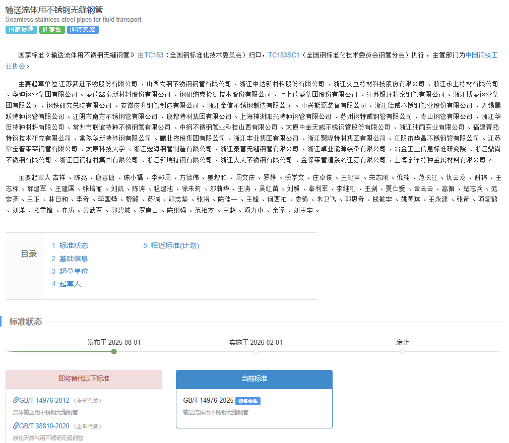 2025年8月1日,由江苏武进不锈股份有限公司 、山西太钢不锈钢钢管有限公司 、浙江中达新材料股份有限公司 、浙江久立特材科技股份有限公司等主要单位起草的国家标准《输送流体用不锈钢无缝钢管》发布,将于2026年2月1日实施。
