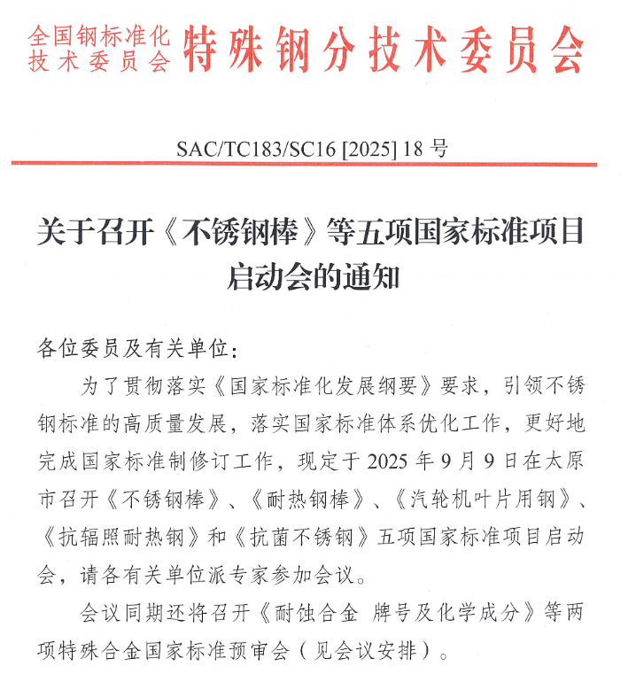 2025年9月9日,《不锈钢棒》、《耐热钢棒》、《汽轮机叶片用钢》、《抗辐照耐热钢》和《抗菌不锈钢》五项国家标准项目启动会将于太原市召开。