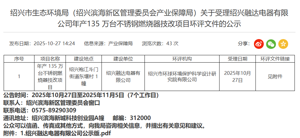 2025年10月27日,绍兴市生态环境局受理绍兴融达电器有限公司年产135万台不锈钢燃烧器技改项目环评文件并对外进行公示,公示时间:2025年10月27日至2025年11月5日(7个工作日)。